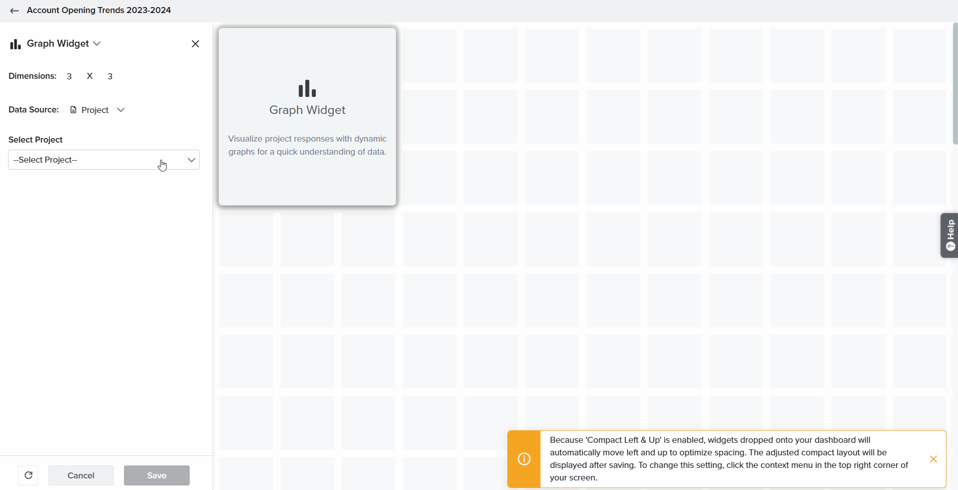 - By default, the Data Source for the widgets is set to Project. Once the widget is added, the dropdown for selecting the project will appear.