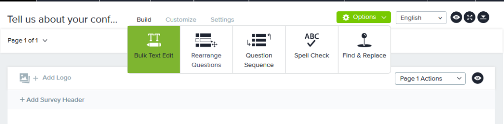 1. Edit Survey Text Button– This button on the survey level toolbar lets you display the entire survey and very quickly edit questions and answer options. It’s a huge time saver because you don’t have to click edit and go into each question you want to edit. It gives you easy editing in one interface.