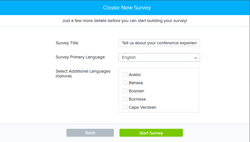 (If you already created a survey and want to add multilingual support: Edit the survey settings under “Survey type.”)
