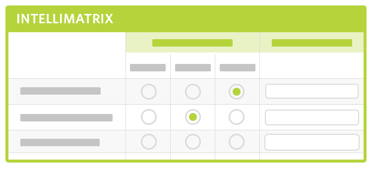 1. Intellimatrix: Many times, we want to capture a comment only if someone ranks or rates below an expected range. You can use Intellimatrix, an advanced Matrix Grid, to do that. You can set a rule that if a rating below a certain threshold is received, make the text box next to it active. See image below.