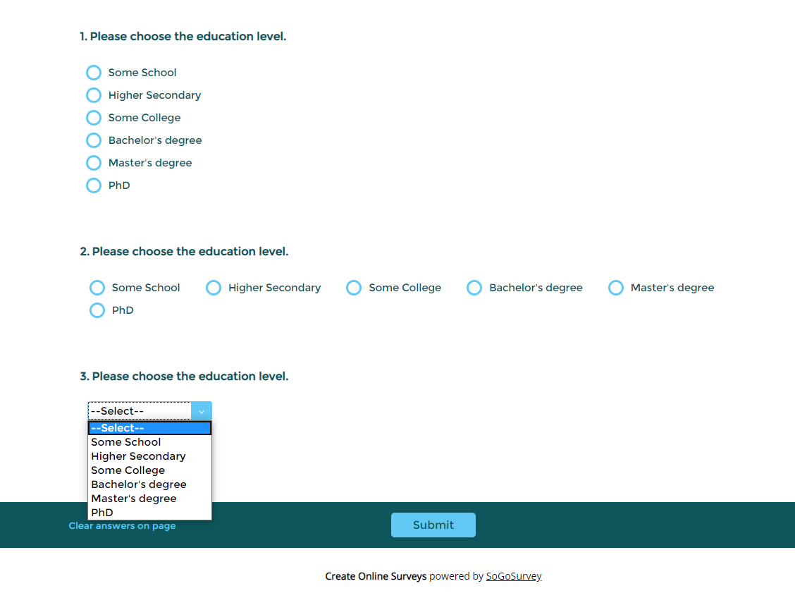 2. Dropdown or Radio Button: Single select or radio button is one of the most commonly used questions types. However, use caution when to display all options on the page or put them in a drop down. The general rule of thumb is put them in a drop-down if there are more than 10 answer options. Also, consider using a Horizontal Radio Button, as the answer options increase.