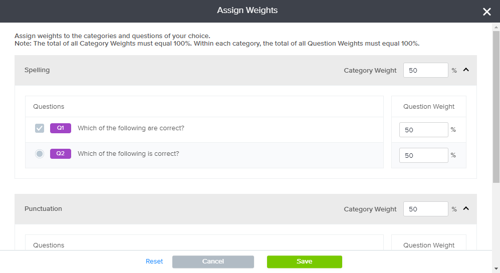 The total of all category weights must equal 100%. Within each category, the total of all question weights must equal 100%.