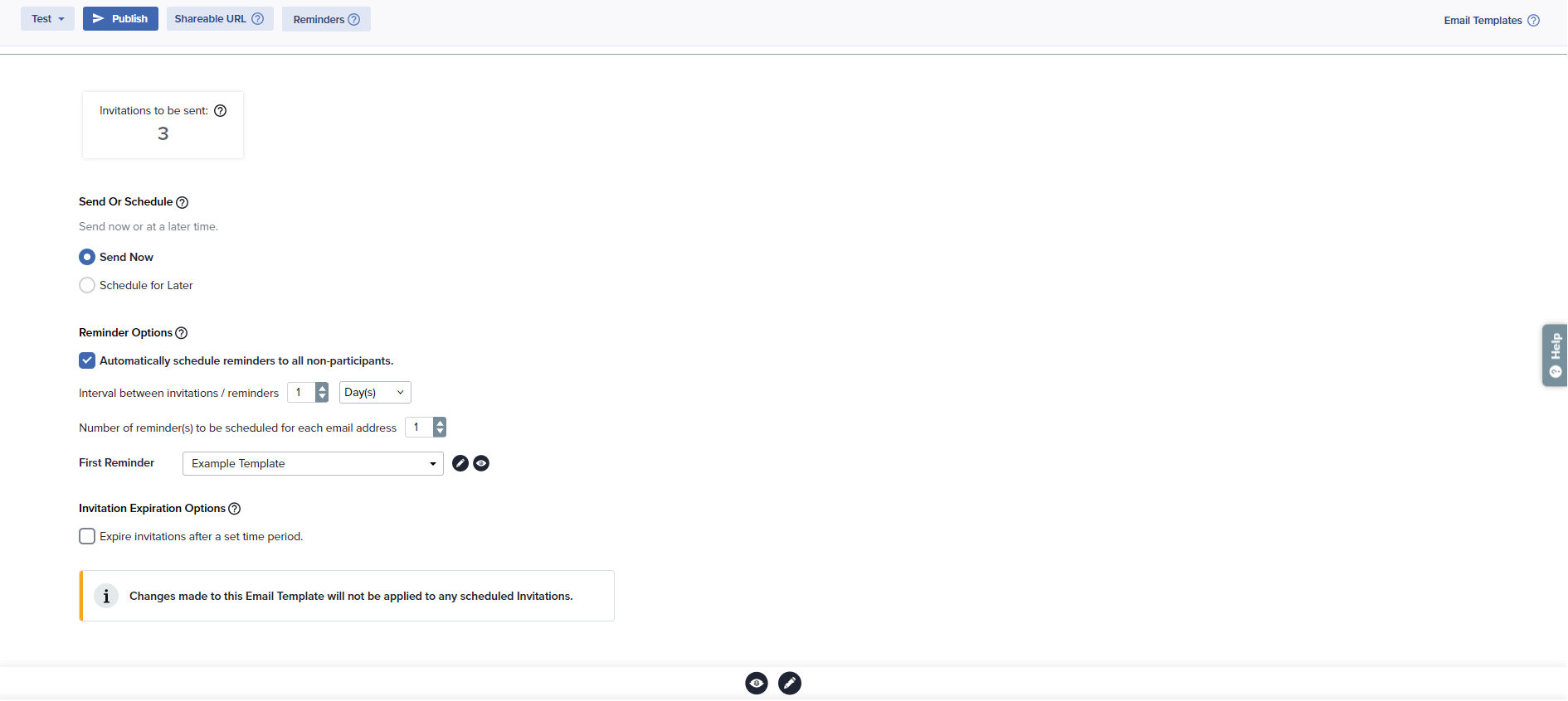 - You can choose to send invitations immediately by clicking Send Now or you can schedule invitations for a future date/time by selecting Schedule for Later.