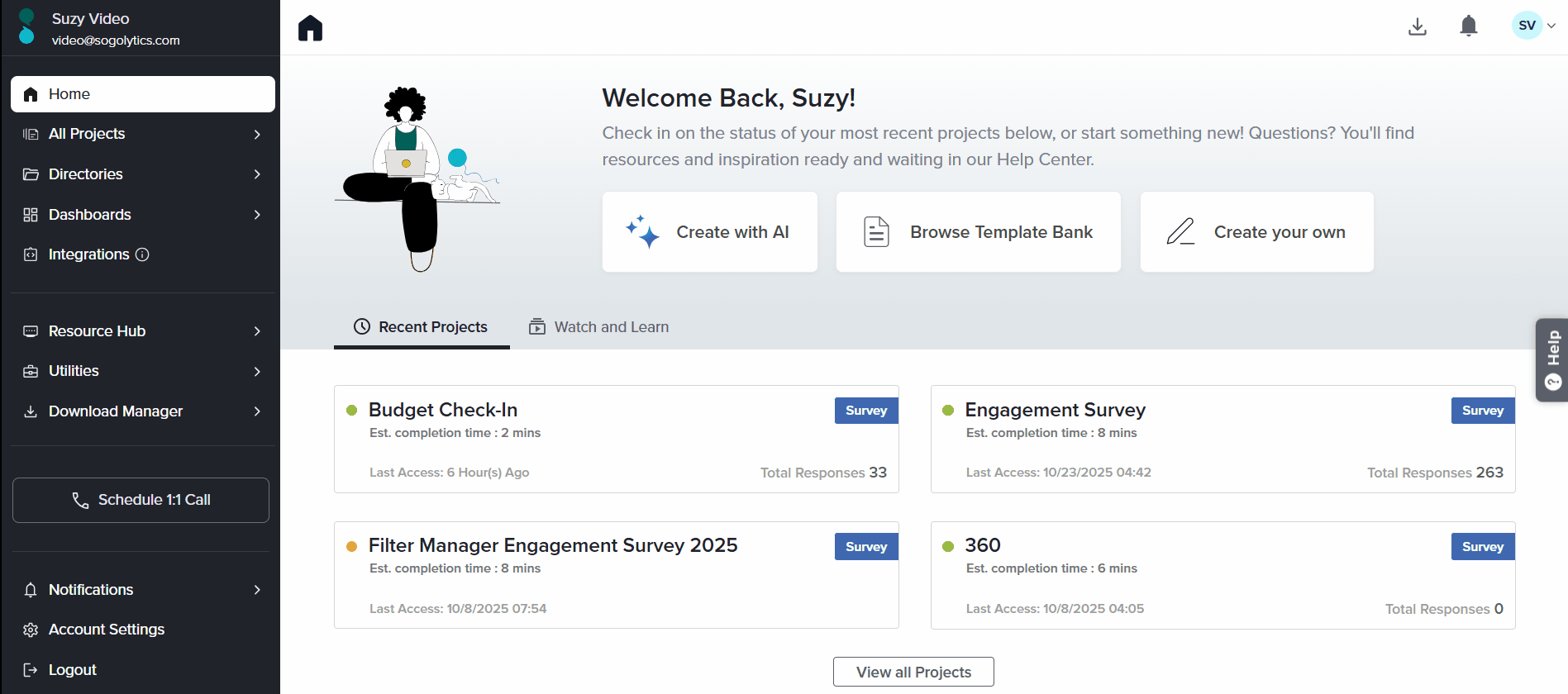 Depending on your account type, you may see an option to schedule a quick consultation with one of our survey experts. Use these calls to check in on technical questions or ensure you’re following best practices in your project. - Video Library