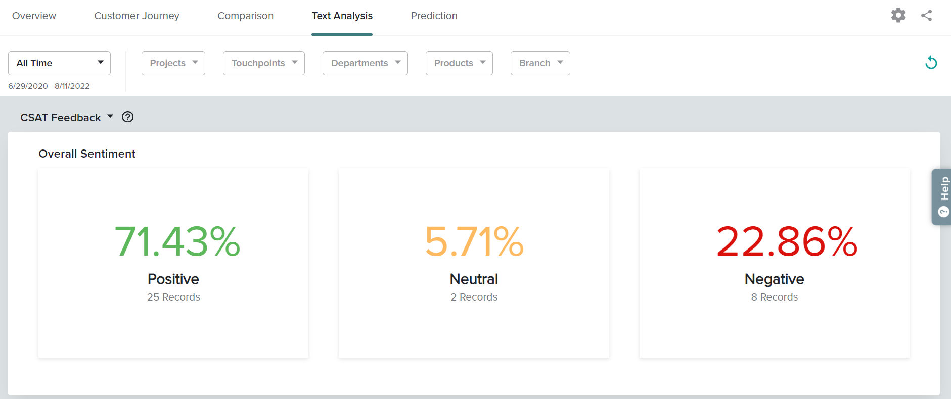 As important as metric questions are in helping you to understand customers’ experiences, it’s equally important to understand the reasons behind the ratings. Whether it’s positive or negative, open-ended responses can provide important insight. Examine common topics, then drill down on positive, neutral, and negative content so you can better understand the important takeaways with Text Analysis.