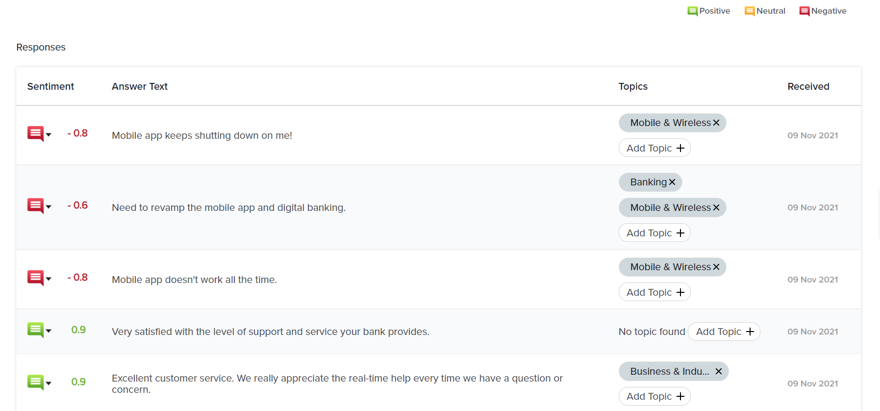 - To change the sentiment of a specific response, click on the icon next to the sentiment and select from the dropdown options.