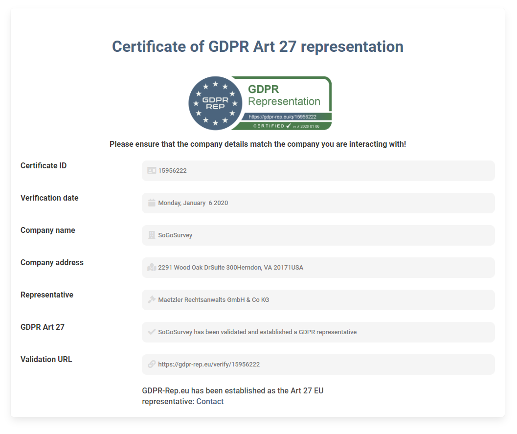 In accordance with article 27 of GDPR, Sogolytics has a certified GDPR representative.