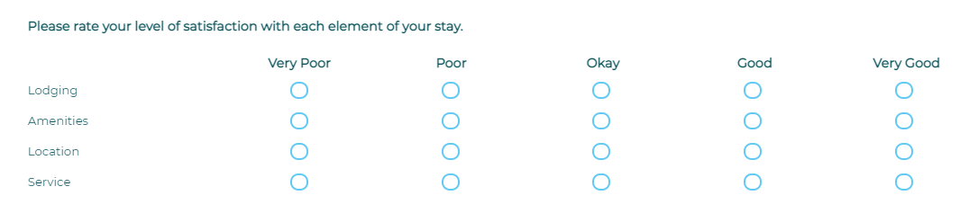 Please rate your level of satisfaction [columns] with each element of your stay [rows].