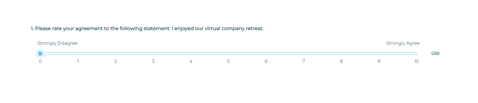 The Rating Scale question type asks a participant to choose a certain value along a continuum, such as level of agreement or satisfaction.