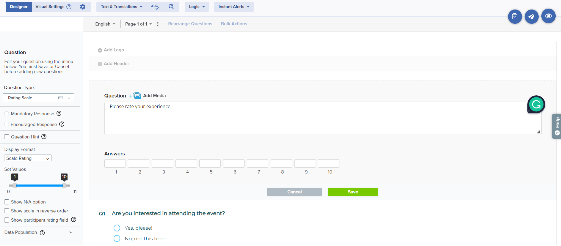 To add a Rating Scale question to your project, drag and drop the question type from the panel on the left to the correct spot on the right.