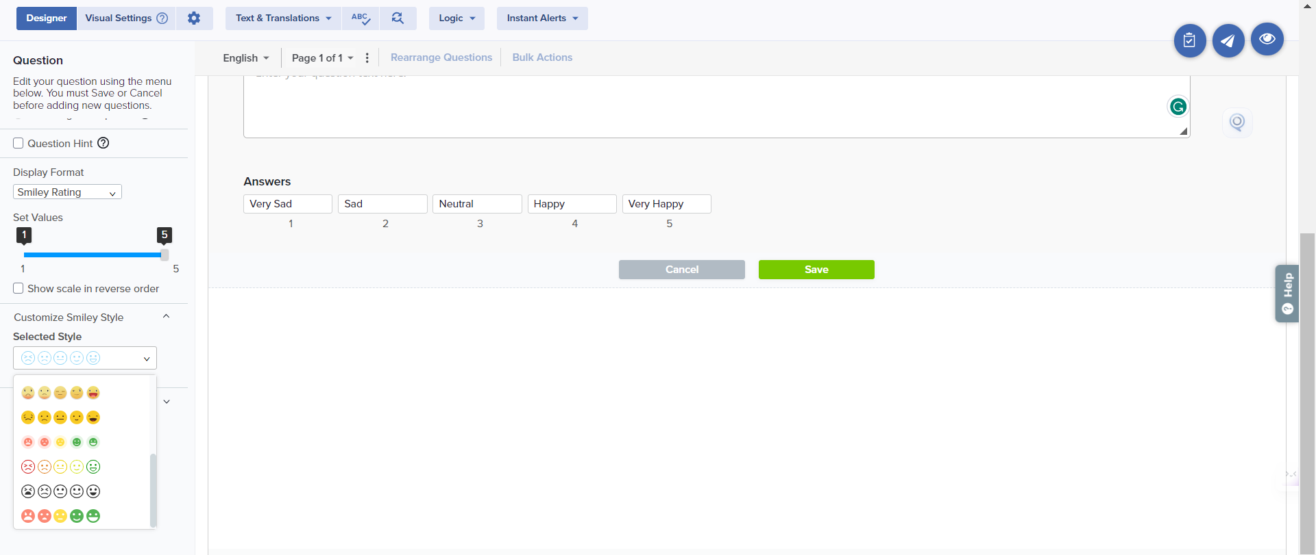 - Select your preferred smiley appearance from the diverse range of options in our emoji palette. Once you’ve chosen the Smiley Rating display format, simply click on “Customize Smiley Style” and select the style that appeals to you the most.