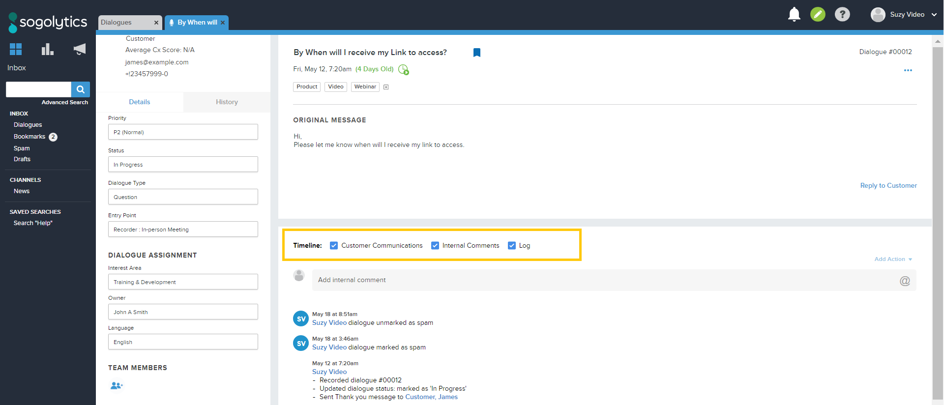 When on the page for a Specific Dialogue, below the Original Message and Dialogue Timeline you’ll see a text box that says “Add internal comment.” Here you’ll be able to make internal notes only those within your organization can see. If you want to tag a specific user or group in your Internal Comment, use “@” for specific people and “#” for user groups.