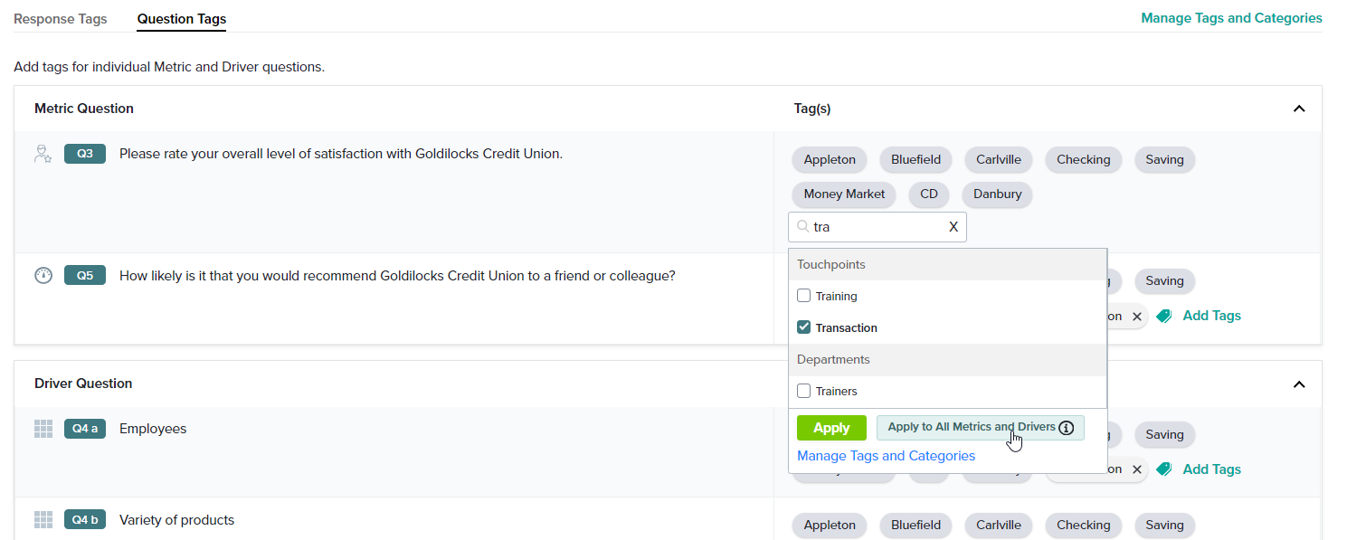 - To add or modify Tags, click Add Tags next to each question, then choose the Tag(s) and apply to all or selected metrics and drivers.