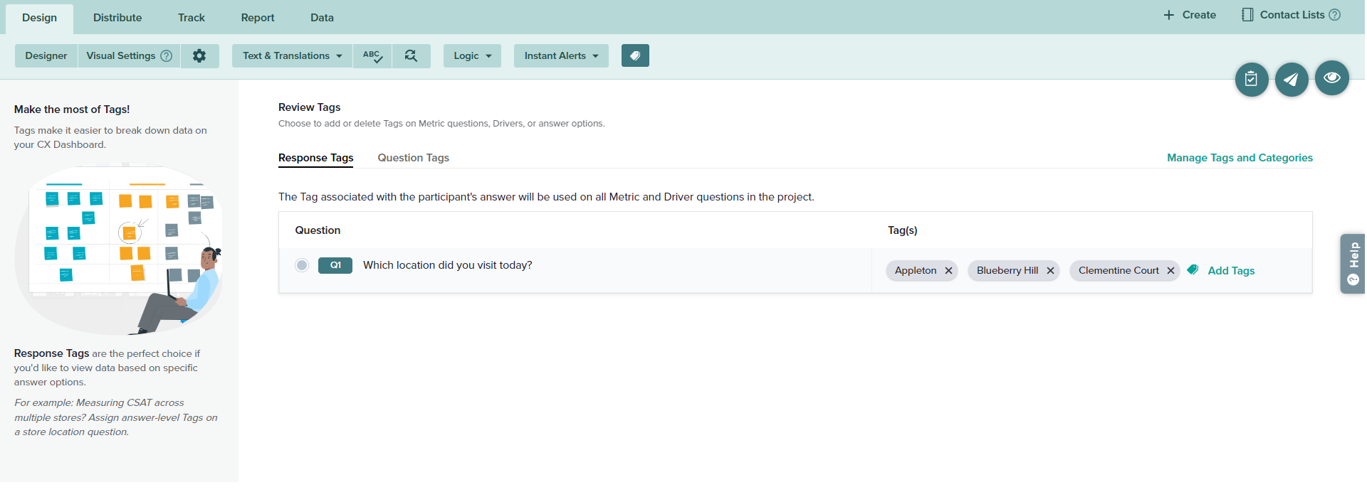 - Question-Level Tags: Use a question-level Tag when you’d like to measure the results of a specific question on your CX Dashboard.For example: