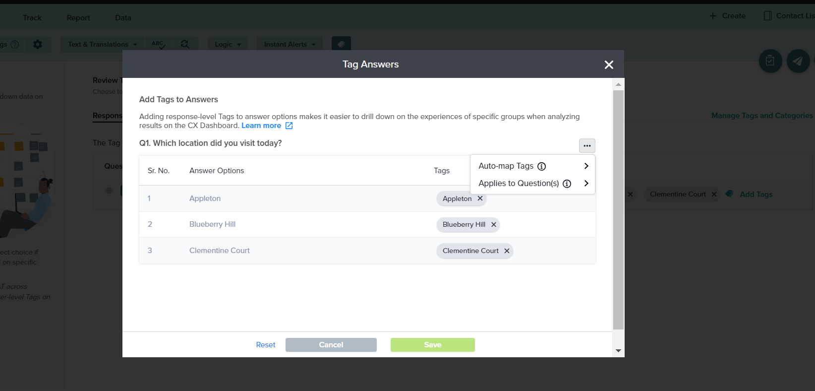 - If the answer options match the Tags in any Tag category, use the auto-map option available under the three dots icon to automatically match answers with the respective Tags.