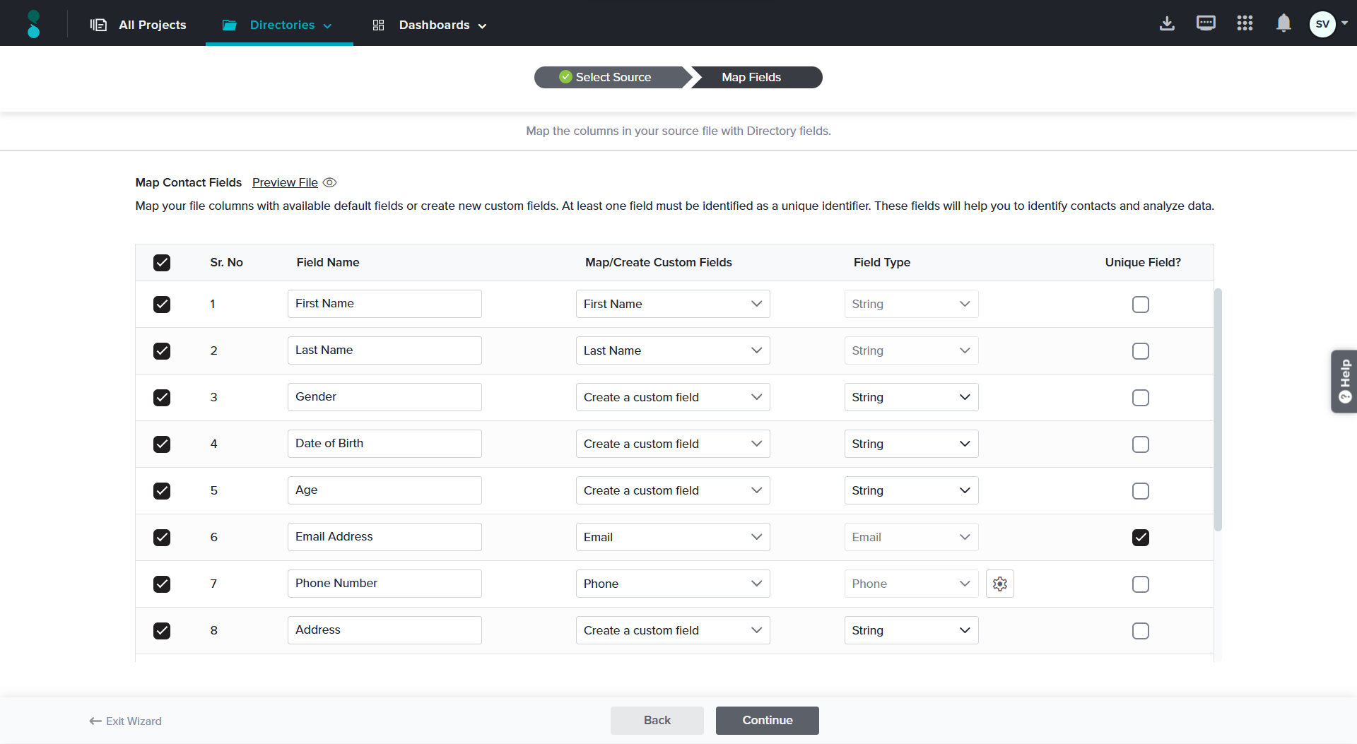 - Within the Map Fields section, you can specify the type for each field being added to the Directory. The system may automatically identify some of the field types being imported. You can import any remaining values as custom fields, along with their appropriate field types.