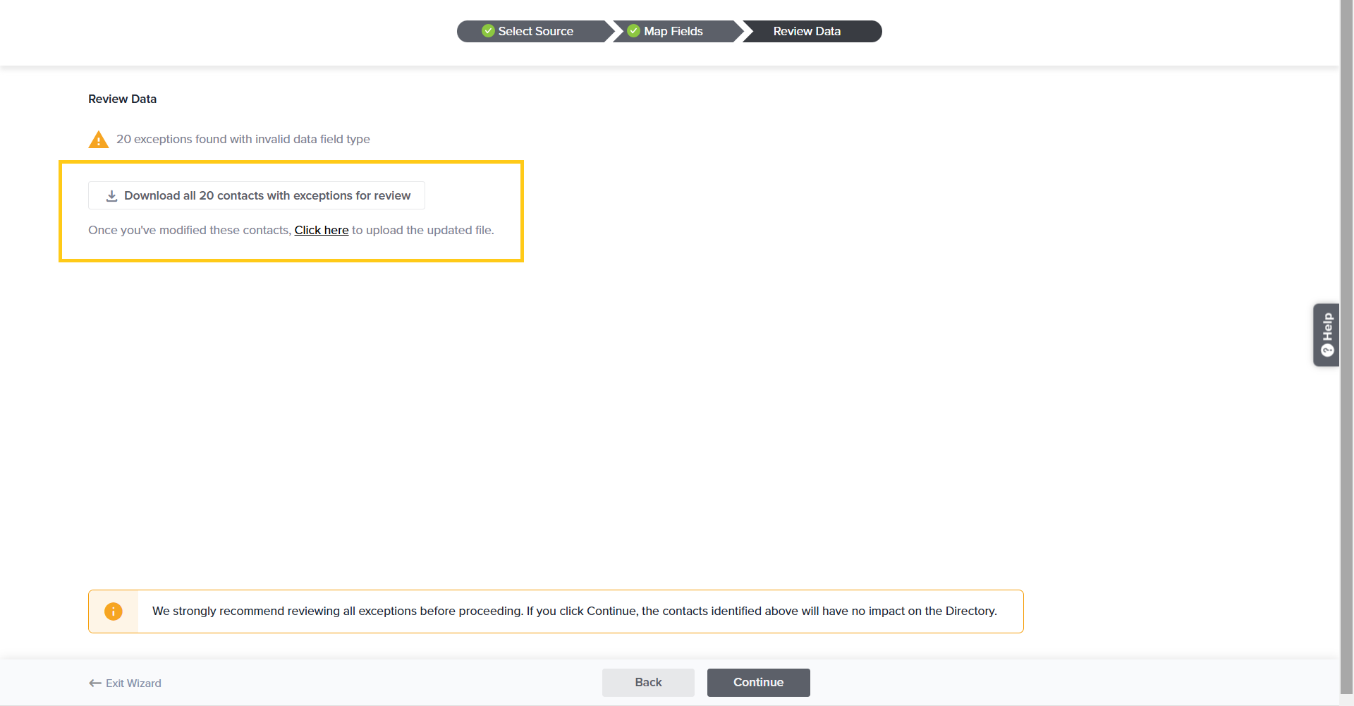 - If any exceptions are encountered, all the exception details will be displayed in the Review Data wizard. You can download the exception file here for a detailed clarification of the fields that have not synced as expected using Download all X Contacts with exceptions for review. You can then either proceed to import the valid Contacts on this page or re-upload the corrected file using the Click Here option.