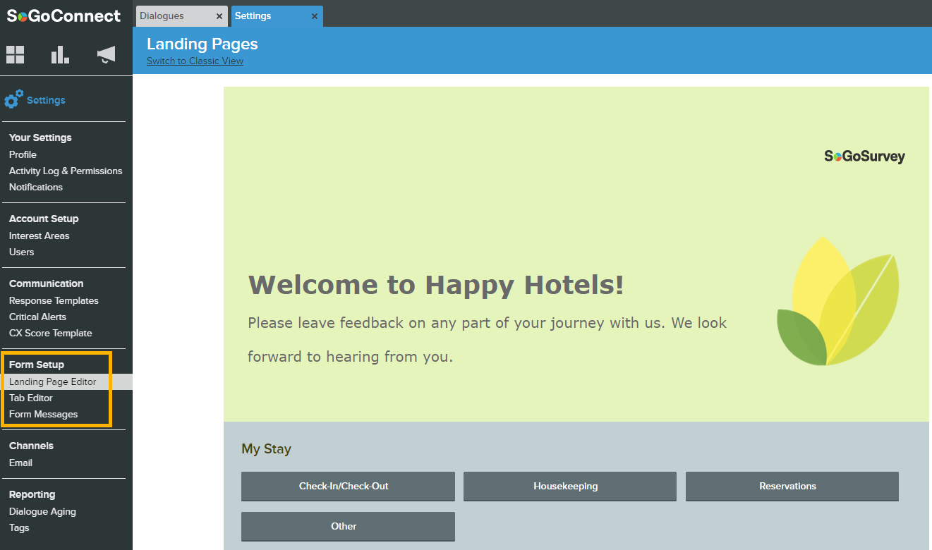 - Under Settings, click on Landing Page Editor (listed under Form Setup).