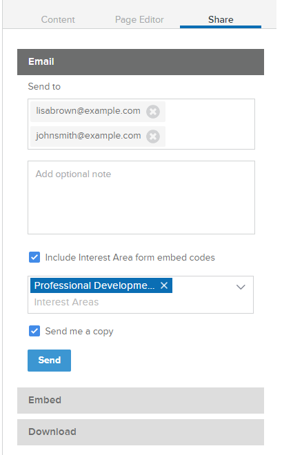 Email: Send the landing page embed code, or the codes for specific Interest Areas, to the recipients of your choice. Provide addresses as well as a personalized message.