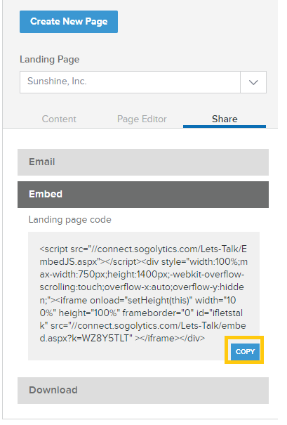 Embed: Copy the iFrame embed code for your landing page directly to your clipboard. You can then paste it in the appropriate place in your web admin tool. Select from the dropdown menu to choose alternate landing pages.