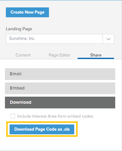 Download: Download an Excel spreadsheet containing both the links and embed code to each of the organization’s Landing Pages. To download individual Interest Area links and embed codes, select ‘Include Interest Area form embed codes’.