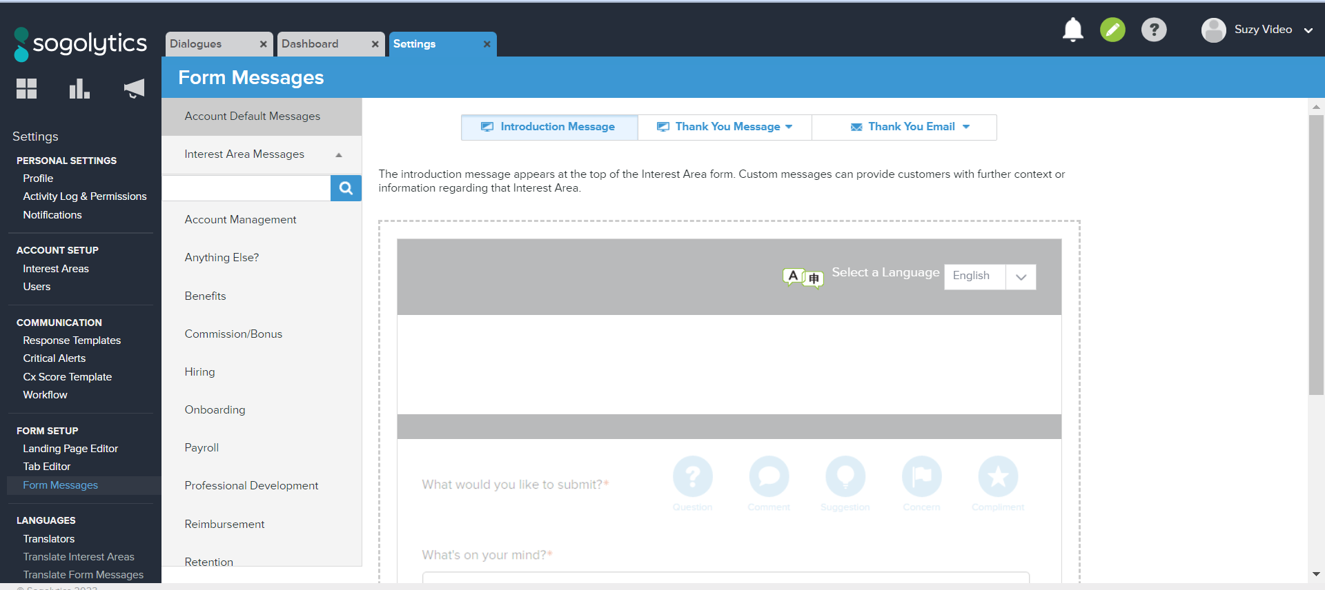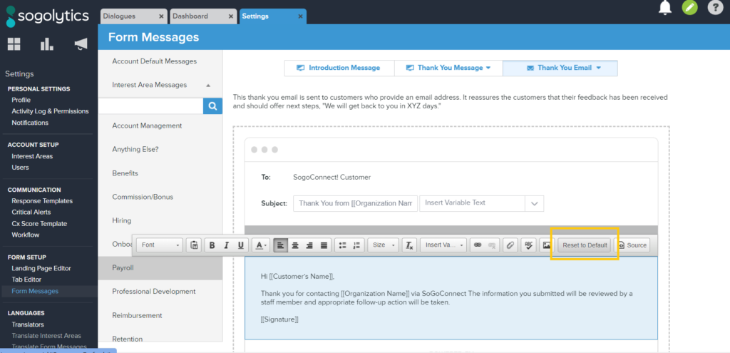 If you are a System Admin, Category Owner, or Interest Area Owner, you can access Form Messages relevant to your permissions. Within this section, you can control the Introduction Message that appears at the top of your Interest Areas, the Thank You Message that appears onscreen post-Dialogue-submission, and the Thank You Email sent to customers who submit their email addresses.