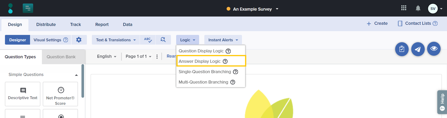 3. Select Answer Display Logic by clicking on Logic in the Design menu bar or by hovering over your Decision question and clicking on Logic.