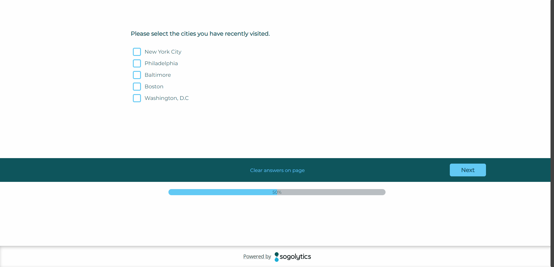 For example: If you’d like to find out where your customers have completed transactions, first ask them which cities they’ve recently visited. Then, in a follow-up question, display all possible branches located in the cities they selected. Smart! In this case, Answer Display Logic saves you space on the page, makes it easier for participants to find relevant answer options, and improves your data quality.