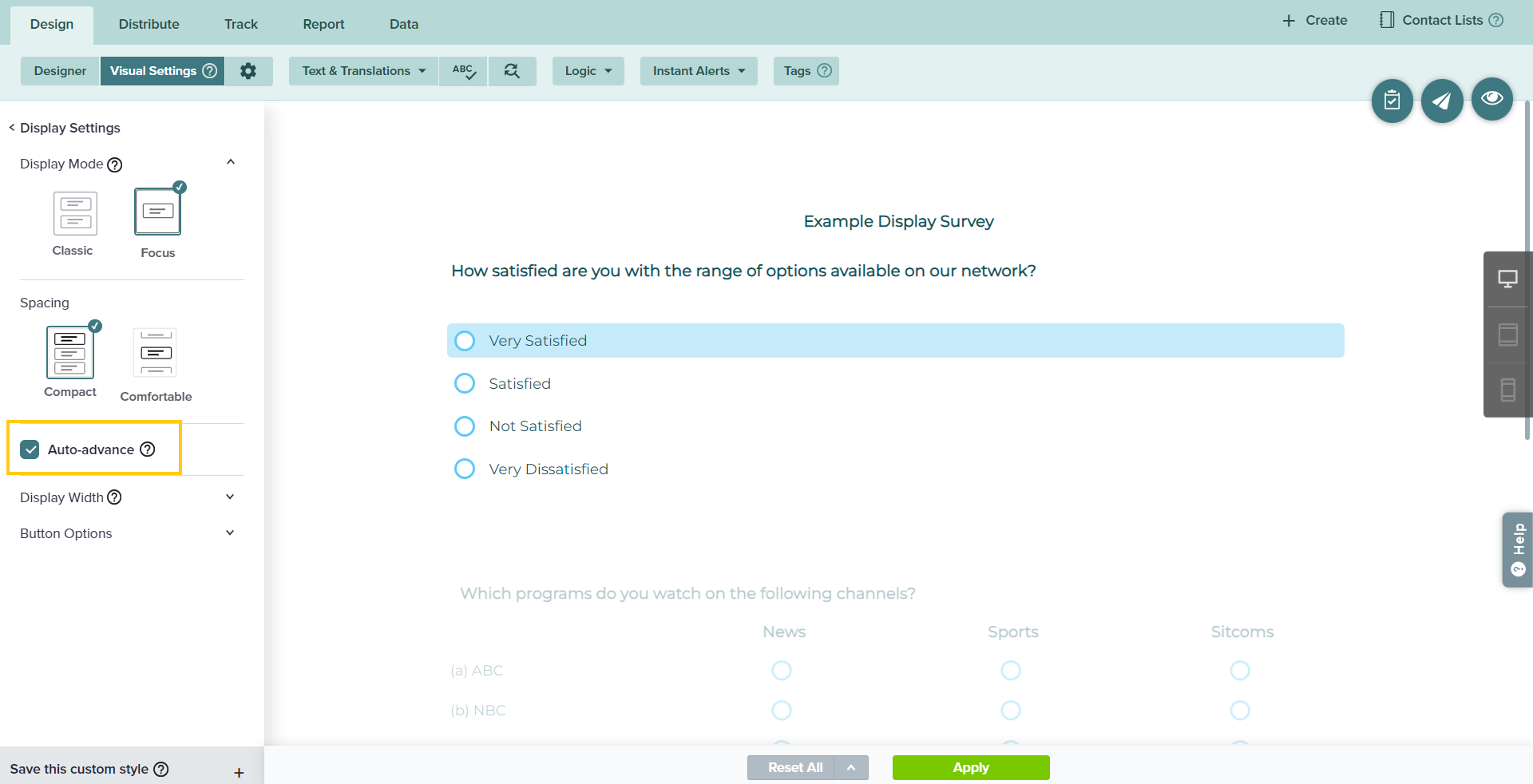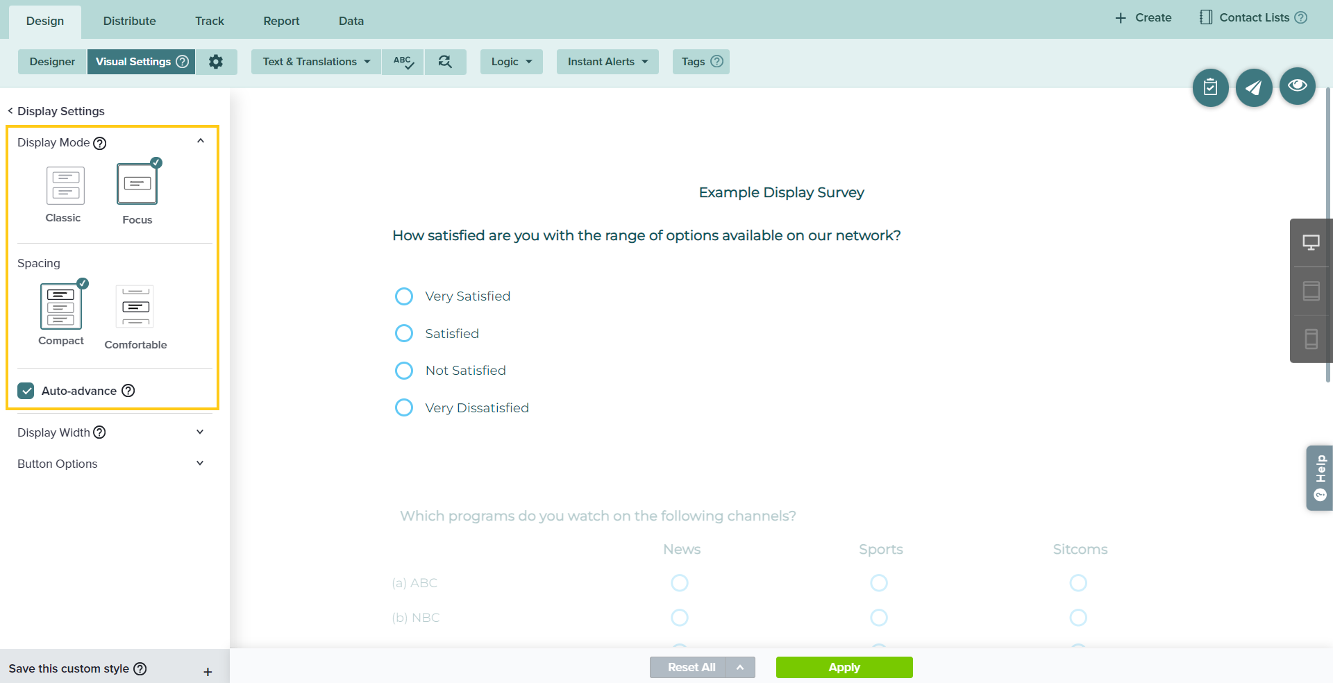 • Focus: This option directs the participant’s view to one question at a time, fading out the rest, and automatically progressing to the next question to encourage faster, focused completion.