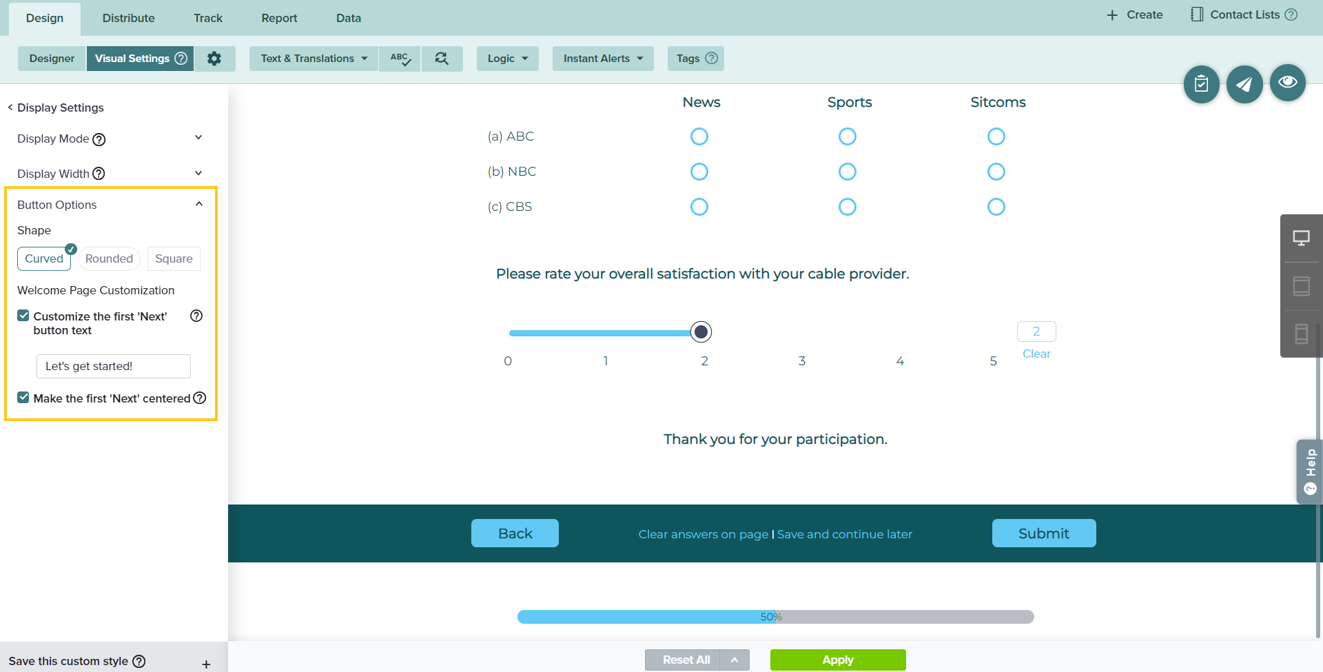 Enhance the visual appeal of your survey by customizing the ‘Back’ and ‘Next’ buttons. This feature empowers you to change both the shape and text of your survey buttons.