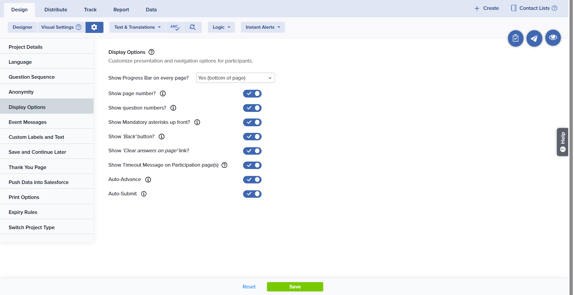 - Auto-Advance: When enabled, participants are automatically taken to the next page once all questions on the current page are answered. This applies only when the last answered question on the page is a closed-ended question.