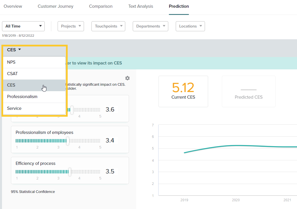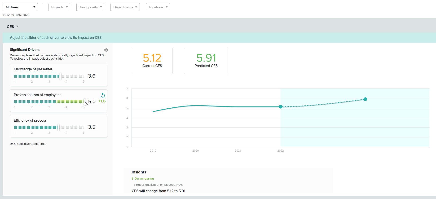 Want to know where to invest your time and resources? Metric prediction allows to study how the variables represented by your CX driver questions impact the metric score. The interactive simulation allows you to increase or decrease CX driver ratings, calculates the impact, and plots the predicted metric score. Examining these results can help you to make decisions about which changes can have the biggest impact on improving your customers’ experience.