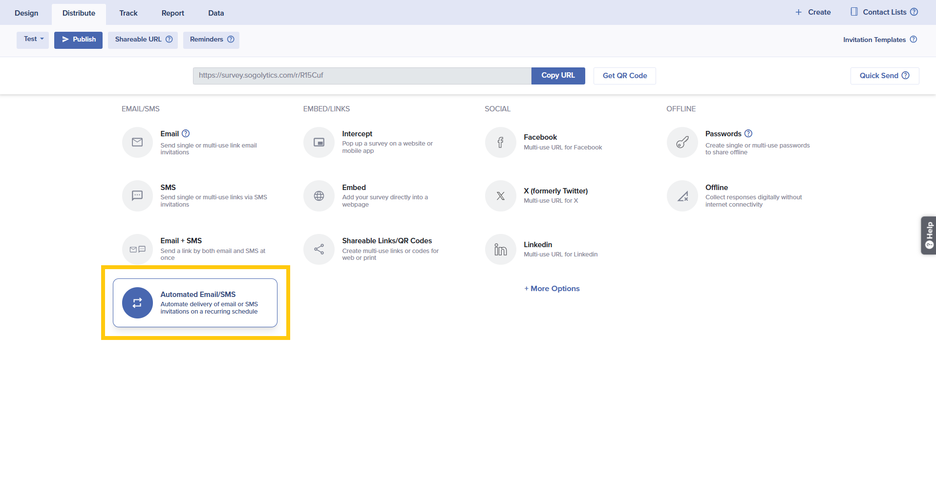 Got an ongoing project that requires regular distribution? Save time and improve efficiency by setting up automatic distribution. While Sogolytics offers a wide variety of choices to improve delivery and participation, one of the smartest choices you can make is to set up automatic delivery — and then put your feet up!