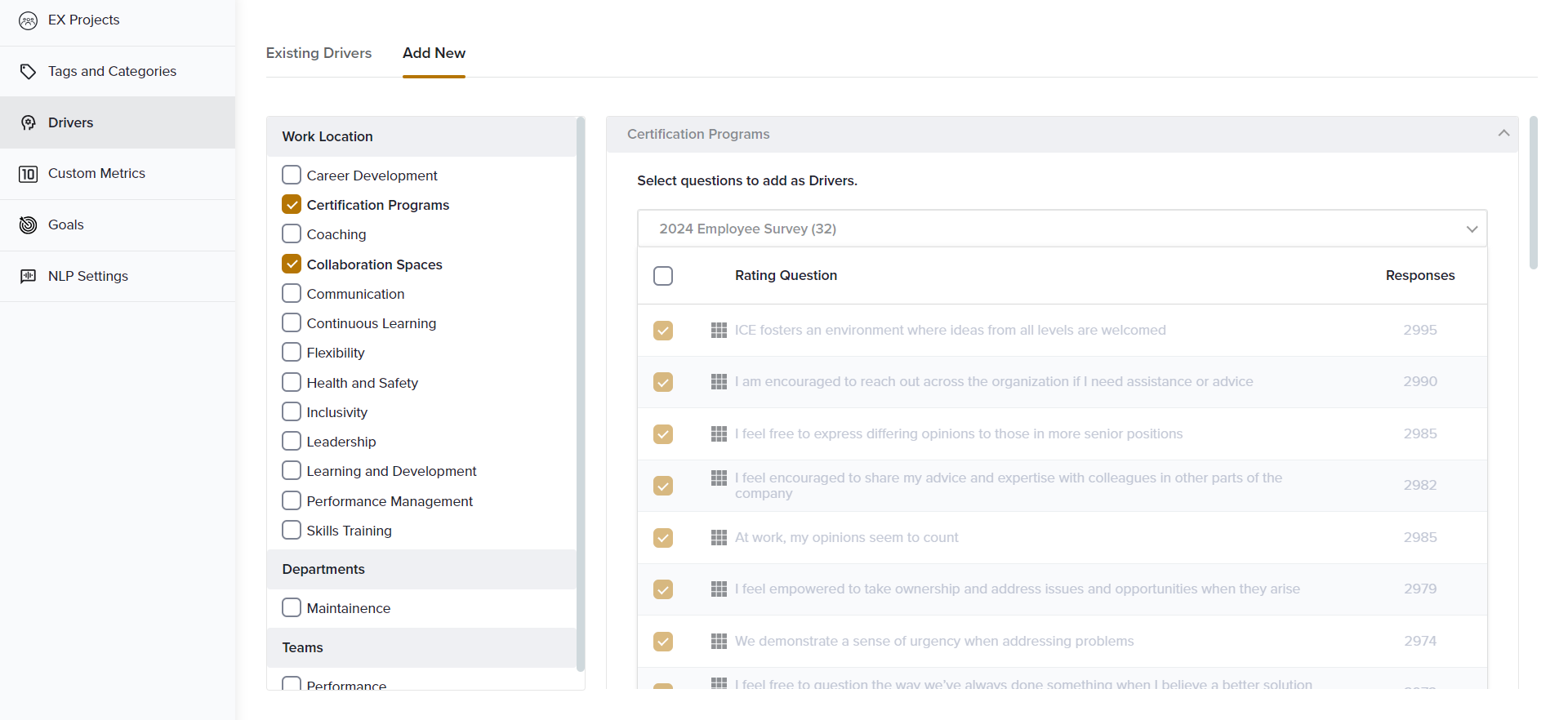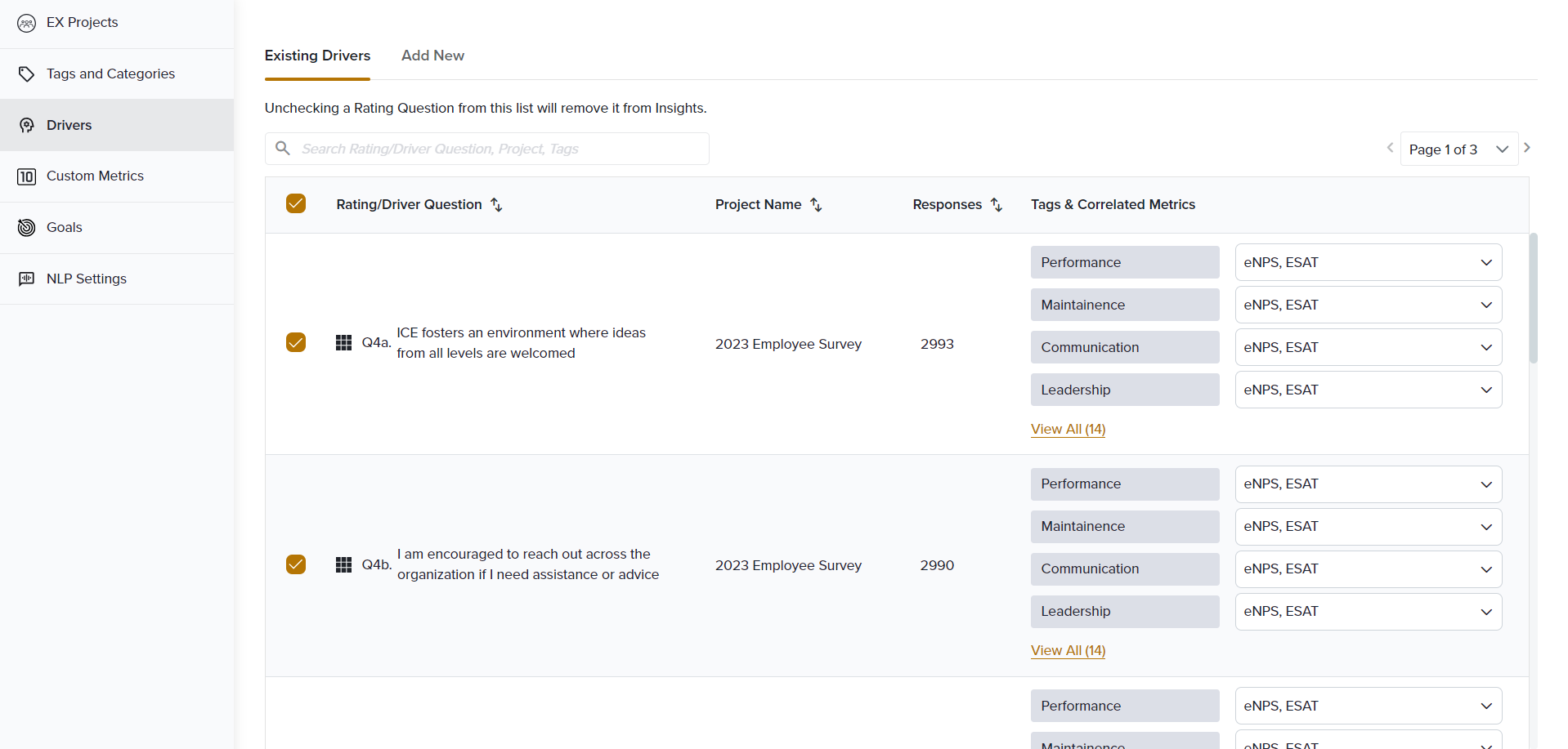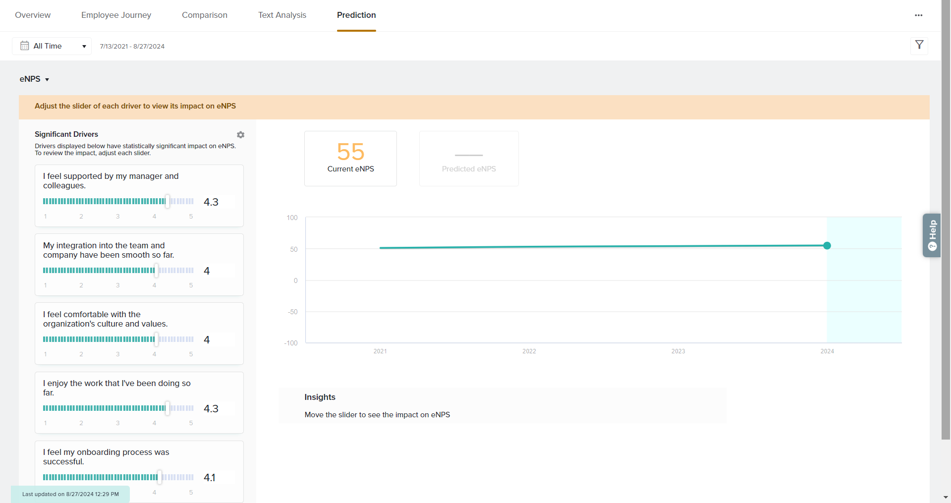 For a deeper understanding of what’s impacting the performance of your EX metrics across Tags, view the Insights section and drill down on key drivers. Understand which drivers matter the most to your employees and track their performance over time.