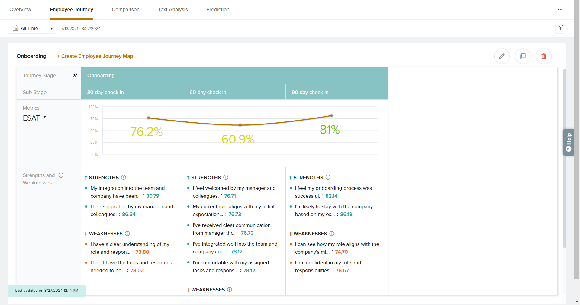 This portion of the Dashboard helps you to map the satisfaction (and other metrics!) of your employees through various stages of their experiences with you. Drill down even more closely to view sub-stages, tracking experience across as many projects as needed. In the big picture, you may create multiple journeys for different groups of employees (those with home loans, those with checking accounts, etc.).