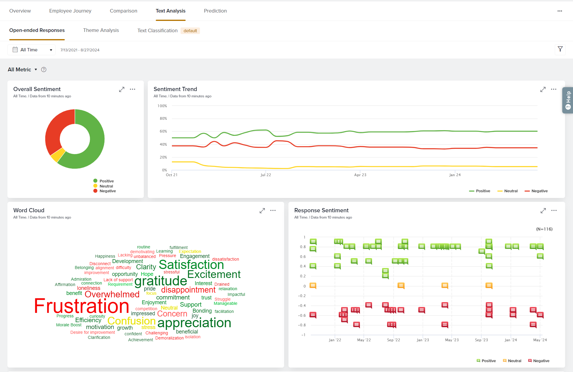 Gauge the sentiments of employees’ open-ended responses, including Overall sentiment, sentiment graph, weekly sentiment score, and more. This section of the Dashboards analyzes content only from EX metric follow-up questions, so you can be sure that these are the most relevant explanations for the ratings displayed throughout the Dashboard.