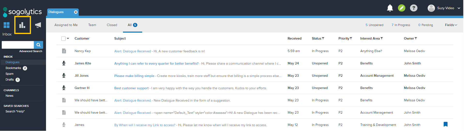 When first signing into SogoConnect, you’ll be brought to the Dialogues page. In the top left corner, below the logo, you’ll see a bar graph icon in between a four-square icon and an announcement icon. Click on the bar graph icon to be taken to the SoGoConnect Dashboard.