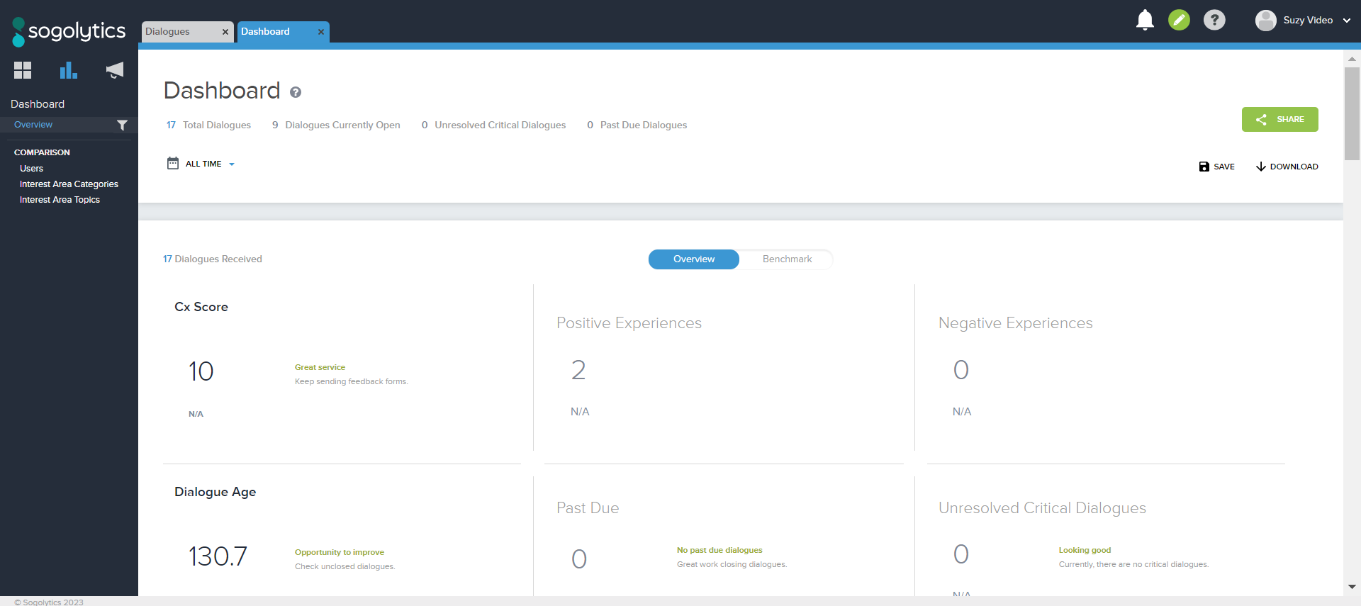 On your Dialogue Overview, you’ll see your CX Score, how many customers had a positive experience, negative experience, the ages of your active Dialogues, Dialogues that are past due, and any unresolved critical Dialogues.