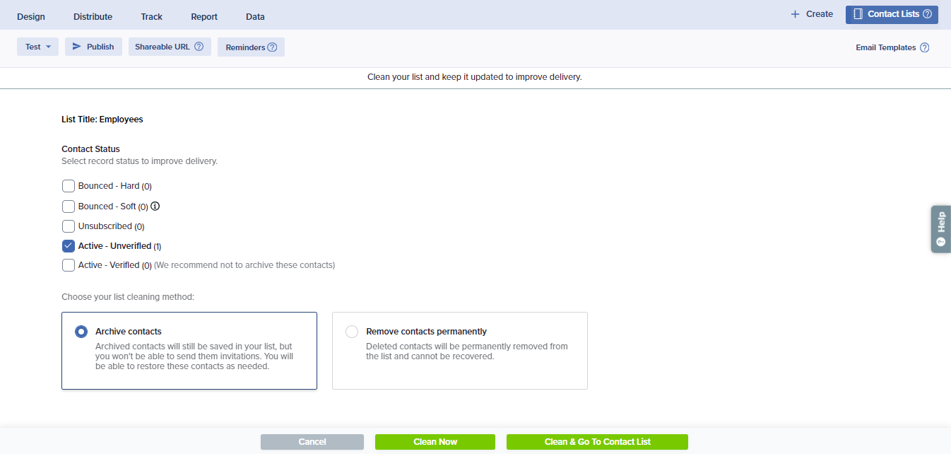 - Click on Clean Now. All contacts with the selected status type(s) will be archived/removed from your List.