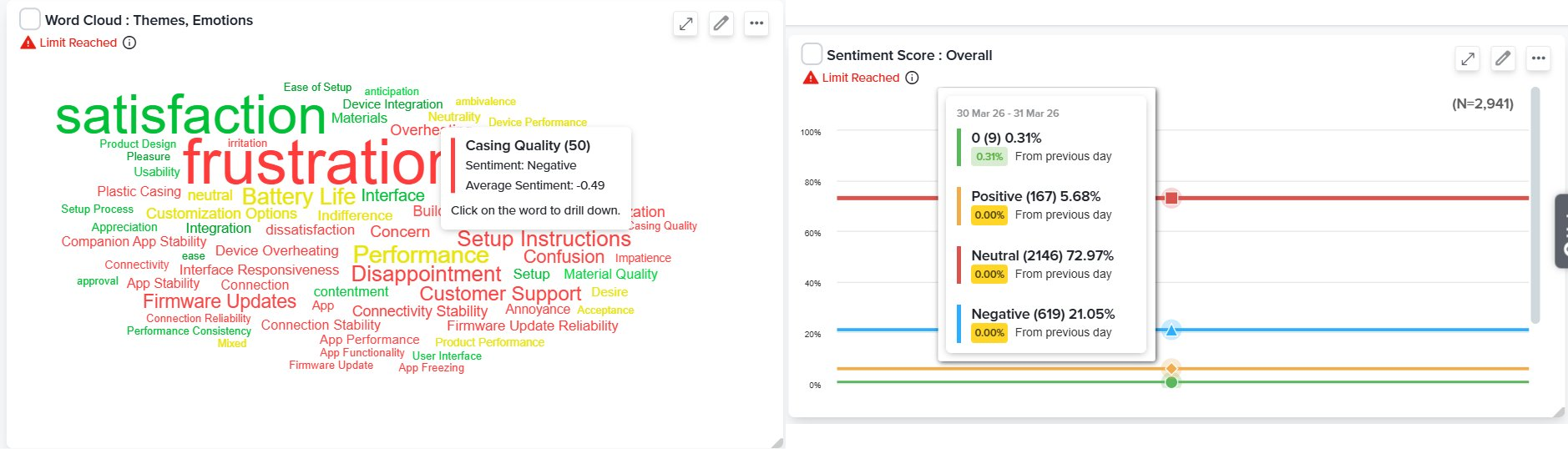 - Trend Graph – Line chart tracking sentiment or theme trends over time. Trend frequency and calculation method are configurable under Advanced Settings.