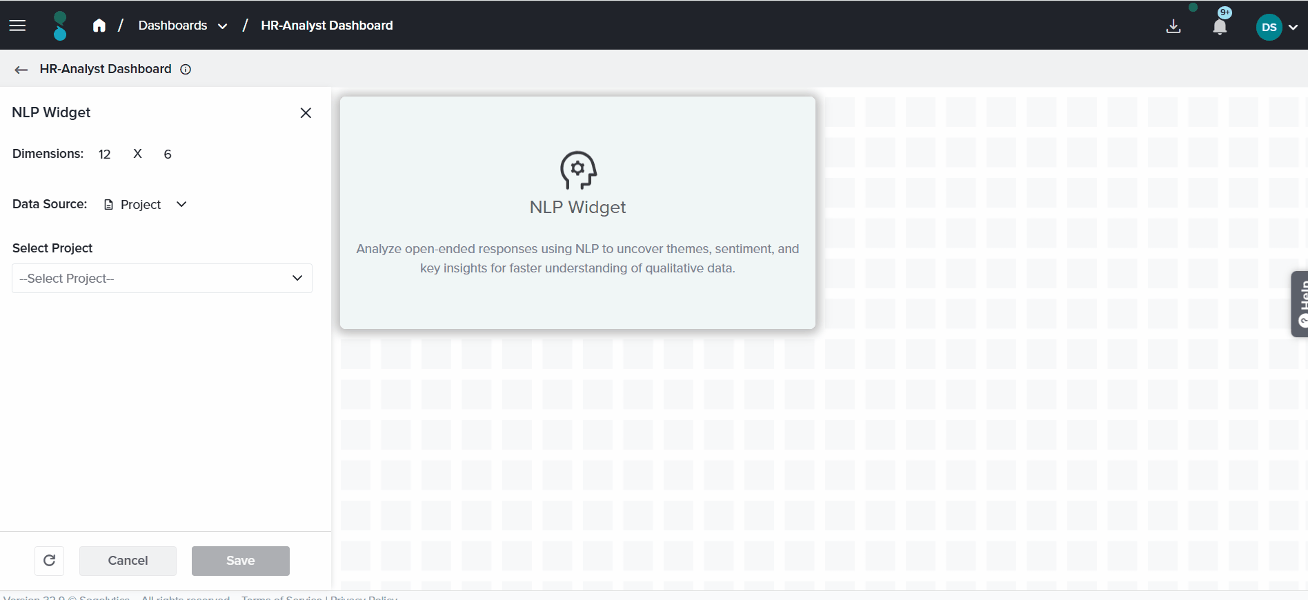 - From the widget selection panel, drag the NLP Widget onto the dashboard canvas.