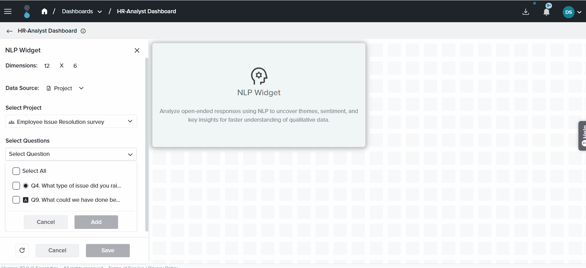 To add an NLP Widget to your Custom Dashboard, follow the steps mentioned below: