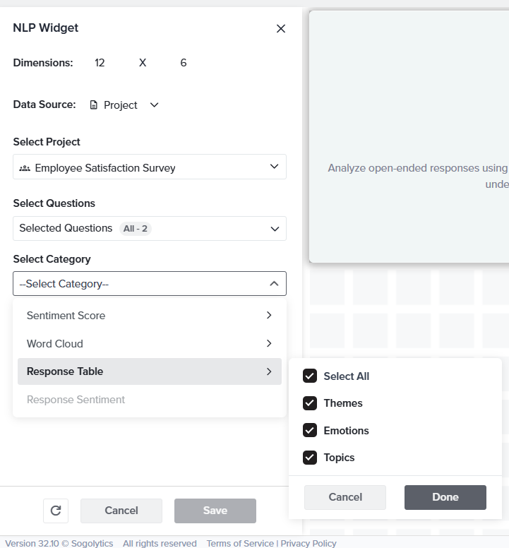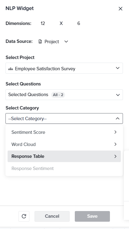 The Select Category dropdown determines the type of NLP analysis rendered by the widget. The following categories are available: