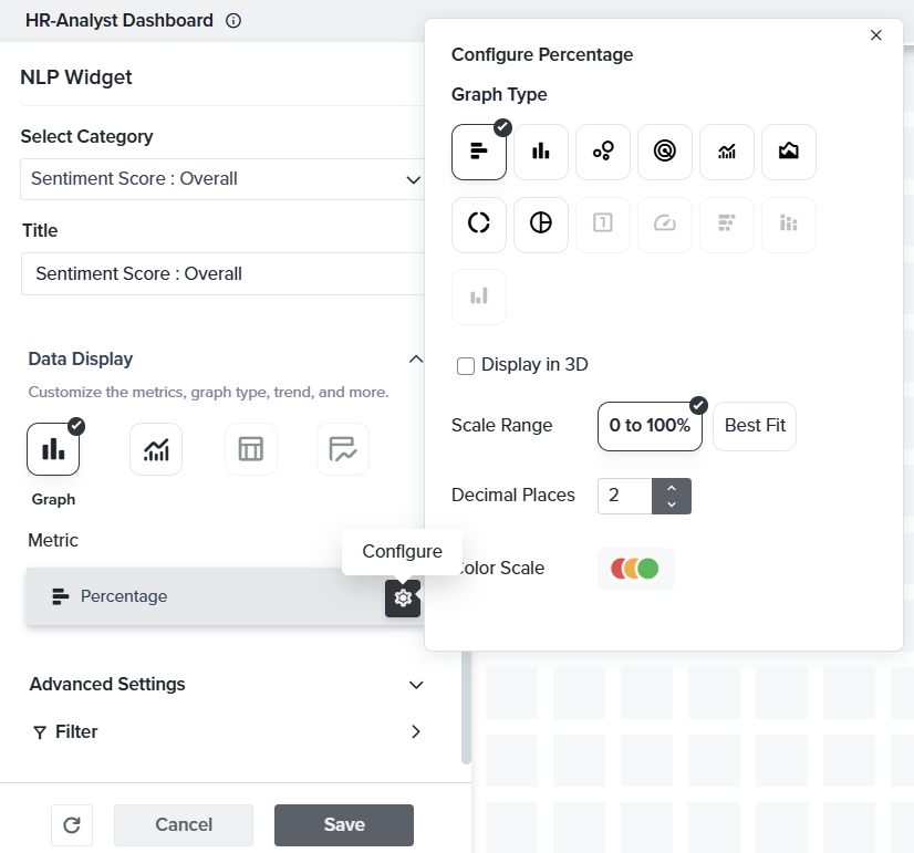 Under Metric, select the calculation method for the display—the default is Percentage. Click the gear icon next to the metric to configure decimal places and additional display settings, such as scale range and color scale. You can also choose to display the graph in 3D.