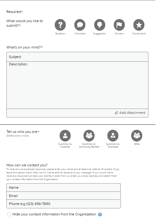 - Response Type: Customers may select only one category – Question, Comment, Suggestion, Concern, or Compliment. Mandatory.