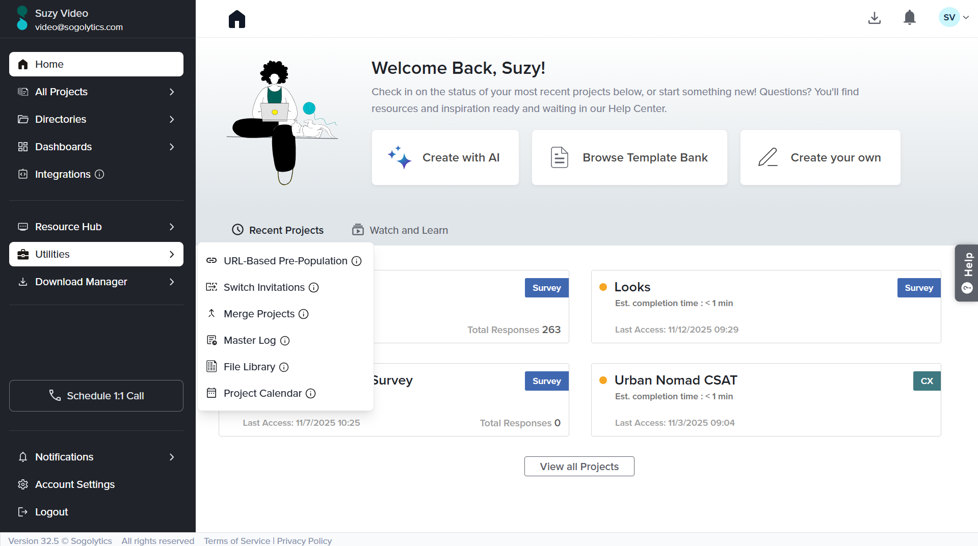 Utilities provides quick access to a range of more advanced features, many of which are more useful after you have designed your project or received responses.