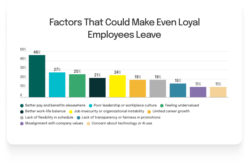 - 60% say they are very likely to stay, yet 46% of that group would still leave for better pay and benefits elsewhere. Retention looks strong, but risk remains active underneath.